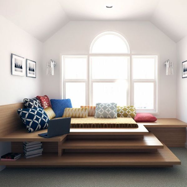 Еще одно решение — система хранения вещей: выдвижные ящики, полочки для книг и другие мелочи прекрасно уместятся под средней высоты подиумом. Расставленные по периметру шкафы и полки завершат оформление идеи.