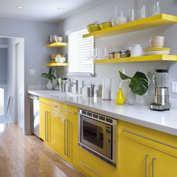 Если нет возможности кардинально менять обстановку, но хочется привнести в кухню новых красок, можно использовать различные желтые акценты. Например, очень часто выбирают новый гарнитур сочного желтого или более приглушенного лимонного цвета. Акценты можно также добавить при помощи яркой посуды, которая будет расставлена на открытых полках.