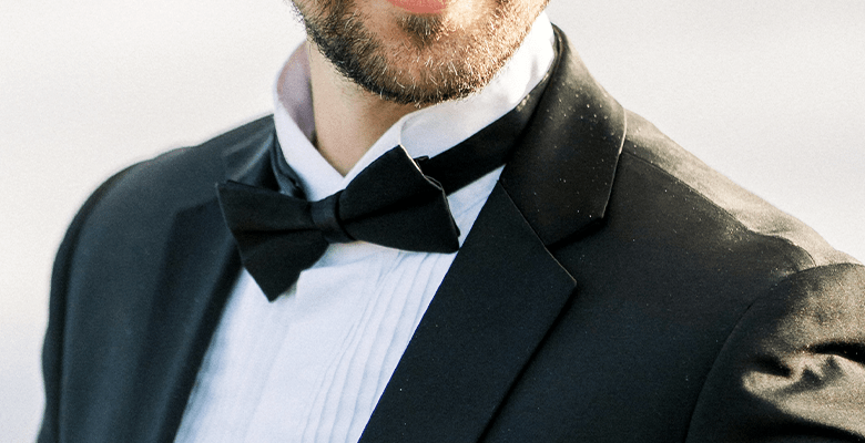 Смокинг – это наряд, который включает в себя однобортный или двубортный пиджак с шелковыми лацканами, брюки с атласными лампасами, белую рубашку с воротником-стойкой и черный галстук-бабочку.