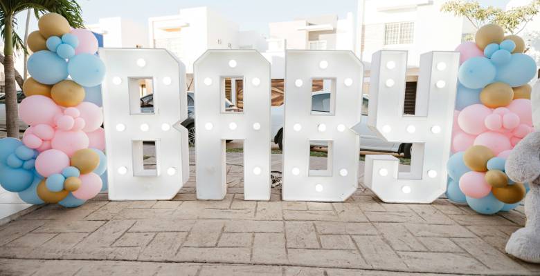 Традиционно используют нежные цвета — голубой, если ожидается мальчик, и розовый, если будет девочка. Пространство украшают шарами, гирляндами, фотозоной и символическими элементами. Красивый декор можно сделать самостоятельно, если вы планируете бюджетный формат мероприятия. Например, заказать универсальные украшения нейтральных оттенков и добавить цветной акцент.