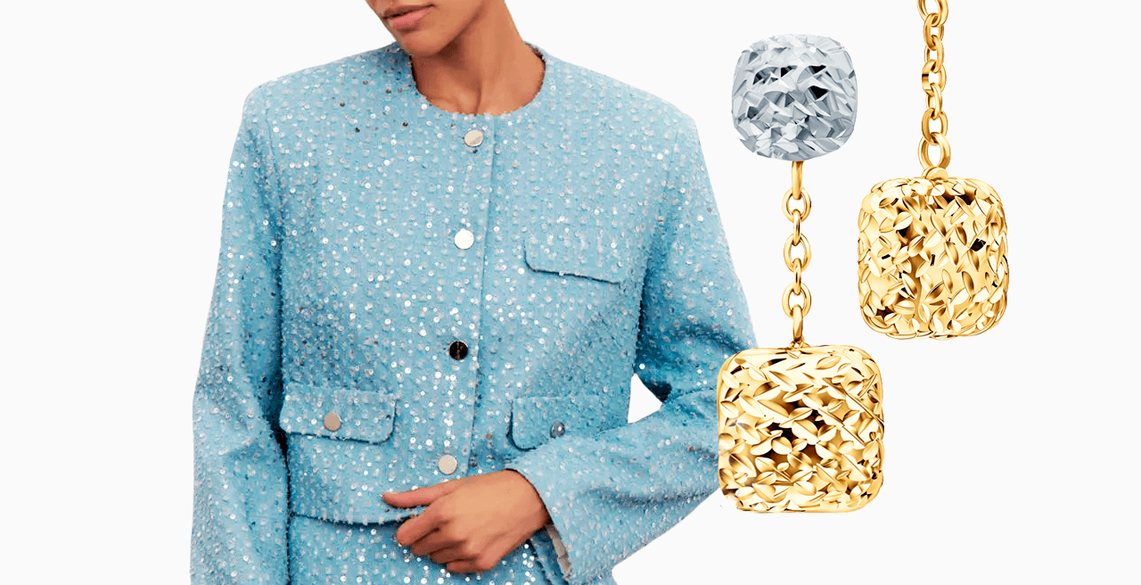 Акцентный пиджак – это всегда беспроигрышный вариант наряда. Я выбрала голубой жакет с пайетками и сочетала его с джинсами клеш. Дополнила образ трендовыми бордовыми миндалевидными туфлями и сумкой-таксой вишневого оттенка. А вот украшения я подобрала с зелеными камнями, которые идеально вписались в наш цветной комплект.