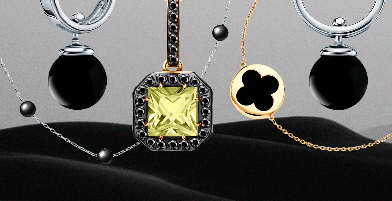 Выбор цветовой гаммы – это не только тренды, но и личные эмоции, темперамент и отношение к жизни в моменте. Если вам сейчас уютно и комфортно в монохроме, то мы подскажем, какие украшения попадут в настроение таких образов – изделия с черными камнями, включая кристаллы, агаты и роскошные черные бриллианты.