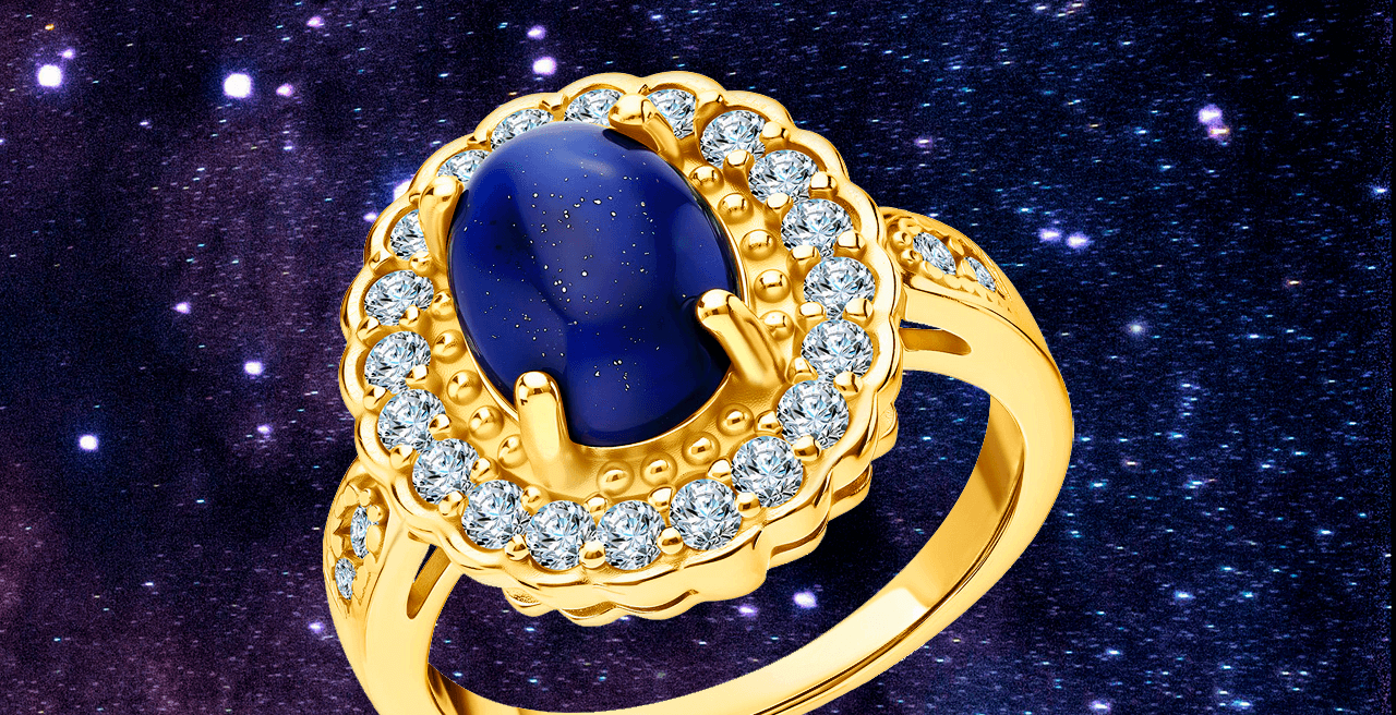 Перед вами эффектный пример украшения, в котором лазурит имитирует ночное звездное небо. Этим кольцом вы точно будете любоваться в ожидании следующего августовского звездопада.