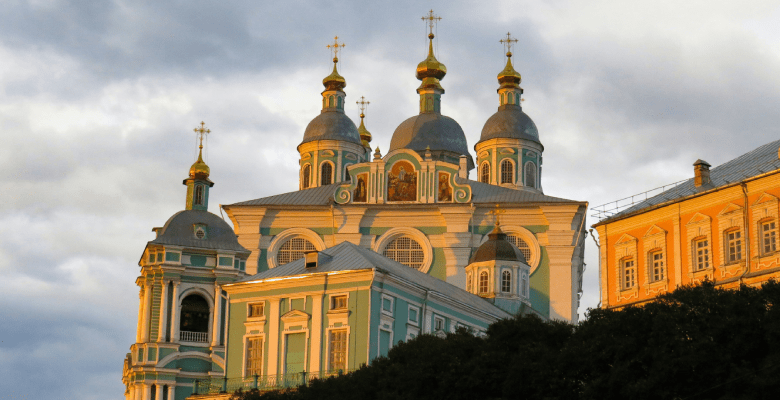 От крепостной стены легко добраться до Успенского кафедрального собора. Первый храм на этом месте был заложен еще в 1101 году Владимиром Мономахом. Современное здание собора было возведено 18 веке. Сегодня храм впечатляет не только размерами, но и богатым внутренним убранством. С соборного холма открывается живописный вид на долину Днепра, что позволяет оценить выгодное стратегическое положение древнего Смоленска.